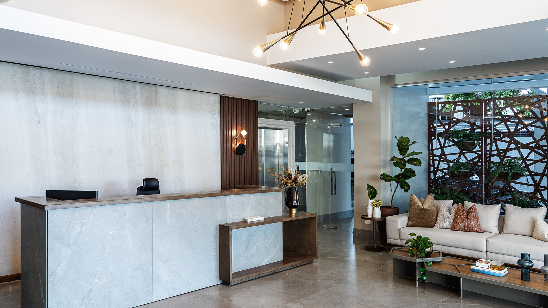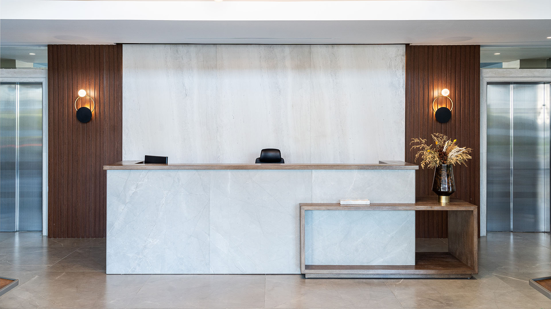 Para Torre Cumbre XII ubicada en Naco, trabajamos el Diseño de Interior del Lobby de la Edificación. Para esta propuesta apostamos por el uso de colores neutrales, tomando como referencia la paleta de colores utilizada en la fachada del proyecto. La integración de materiales naturales como el revestimiento de mármol y madera en la pared de fondo fue de vital importancia para crear un ambiente sobrio pero a la vez acogedor.
